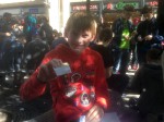 Papa hat von mir beim Tauschen Fotos gemacht. Ich habe ungefähr viermal getauscht, danach sind wir erst einmal eine Krakauer als Currywurst essen gegangen. Danach habe ich weiter getauscht, ich habe mich gewundert, dass auch Erwachsene (18 bis 50 Jahre) und Jugendliche (13 bis 18 Jahre) das Panini Buch sammeln und Sticker tauschen.